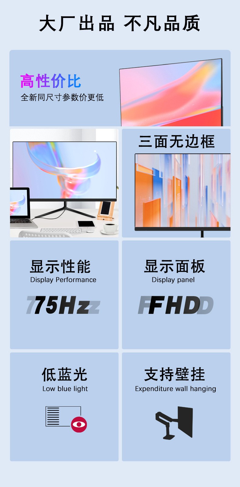 液晶显示屏无边框平面家用高清台式显示器